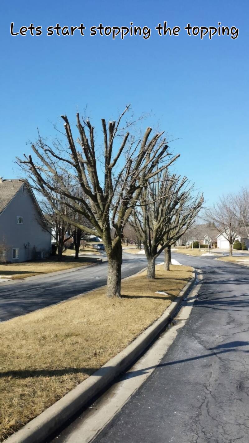 There is a myth that goes around saying it's ok to top your tree, it promotes good growth, or your tree is too tall. The truth is this is all false knowledge when coming to the health of a tree. You're trees leaves are a huge source of the food for the tree. When topping it your losing 50-100 percent of its foliage. When this is all removed along with it looking mutilated your also starving it leading to it to have anxiety, going into to fight or flight mode! It has dormant buds set for the following year, when topping, it activates these and cause sprouts to pop up below where the cuts were made. This is not good growth it's actually the opposite. It grows extremely fast and is very weak. With all the foliage gone it also leads to sunburn on the exposed bark. This can lead to a branch or part of the tree dying . It also puts extreme stress and leaves the tree more susceptible to diseases and insects. It can't defend itself with little nutrients. A tree knows to close up a wound when properly pruned. When topping it leaves stubs or wounds that can't close or compartmentalize like it suppose to. Which leads to decay and possible death. Lastly it's get to be extremely expensive ( if the tree can survive ). With constant sprouts it will need topped every year or two. Then when it dies it will need to be removed. It also causes hazardous situations due to the branches being weak. In the end A tree is meant to grow tall, there are ways to handle it, and it's not promoting good growth to the tree, yet a slow death.